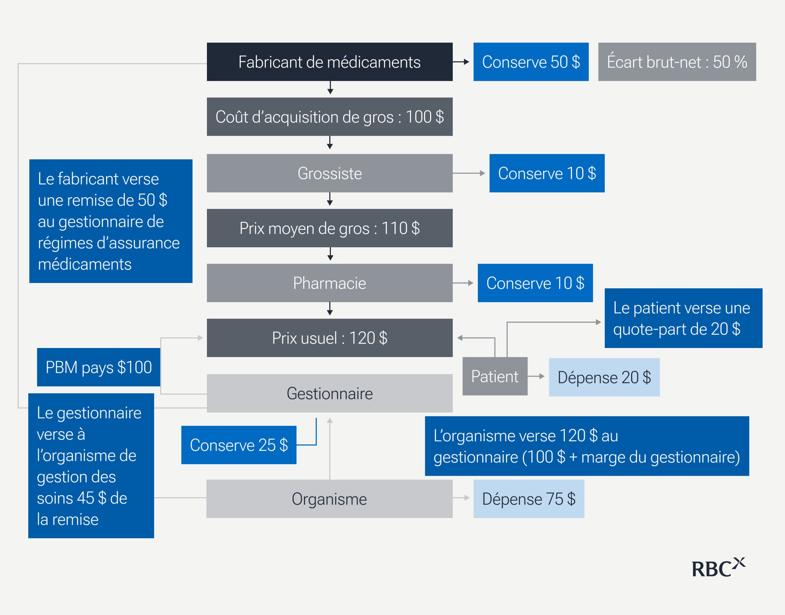 - Le gestionnaire de régimes d’assurance médicaments agit à titre de gardien financier, contrôlant l’accès aux listes et les négociations avec les fabricants. Il reçoit la remise de 50 $ du fabricant, transfère 45 $ à l’organisme de gestion des soins (il garde 5 $) et conserve la différence de 20 $ entre le prix exigé par l’organisme de gestion des soins (120 $) et le remboursement de la pharmacie (100 $), ce qui représente un total de 25 $.